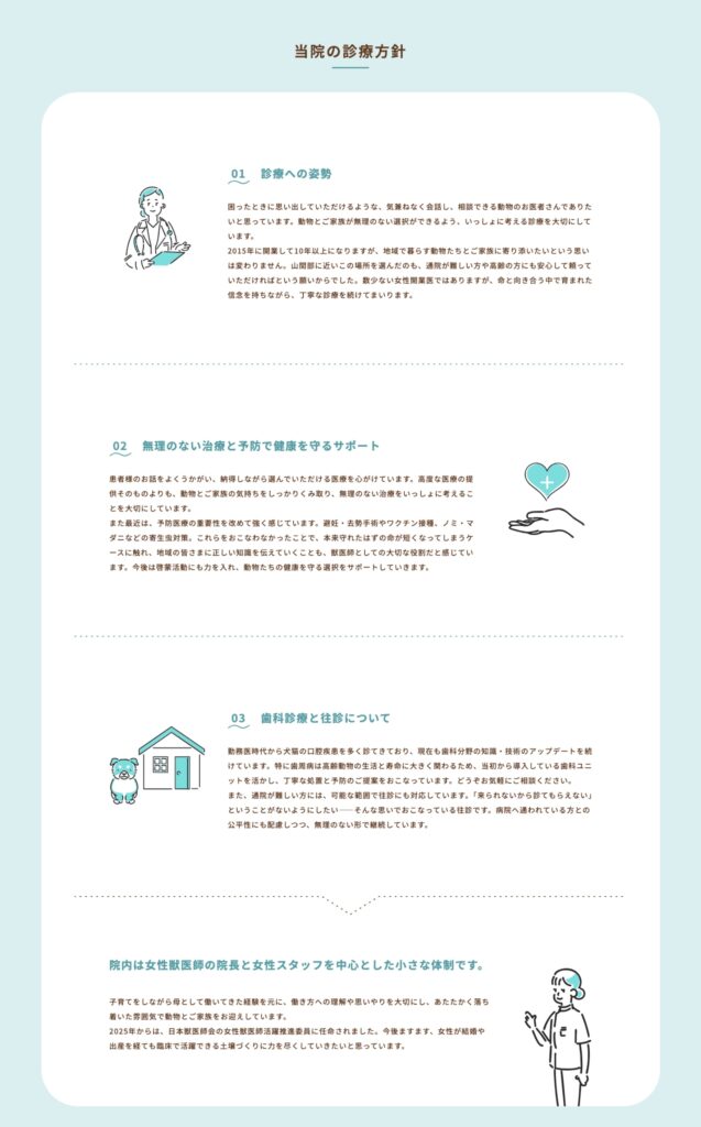 院長を務めていらっしゃるのが女性の獣医師であることから、その点がより伝わるよう意識しながらサイトを構成しています。
